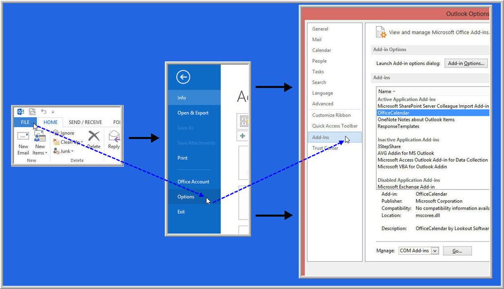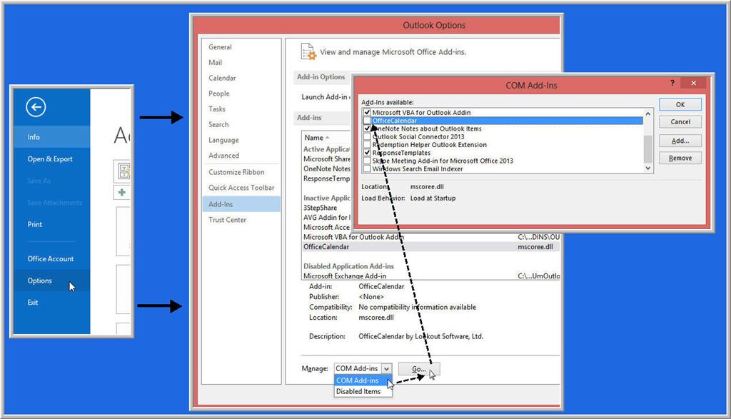 4. Go back to the "Add-ins" section, go to the "Manage" dropdown and select "COM Add-ins" and click "Go". 5. Scan the listing for "OfficeCalendar" and if present but not check marked, place the checkmark in the option for "OfficeCalendar". Then click <and HOLD for 3 seconds> the "OK".