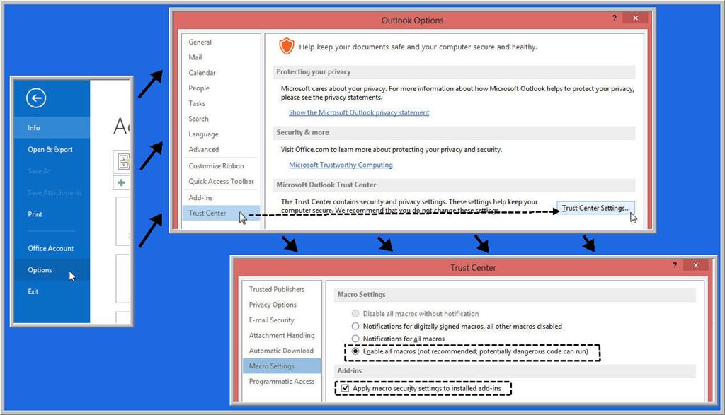 1. Click "Trust Center" option > click "Trust Center Settings...". 2. Click the "Macro Settings" > select "Enable all macros". 3. Checkmark the "Apply macro security setting to installed add-ins" option > click "OK".