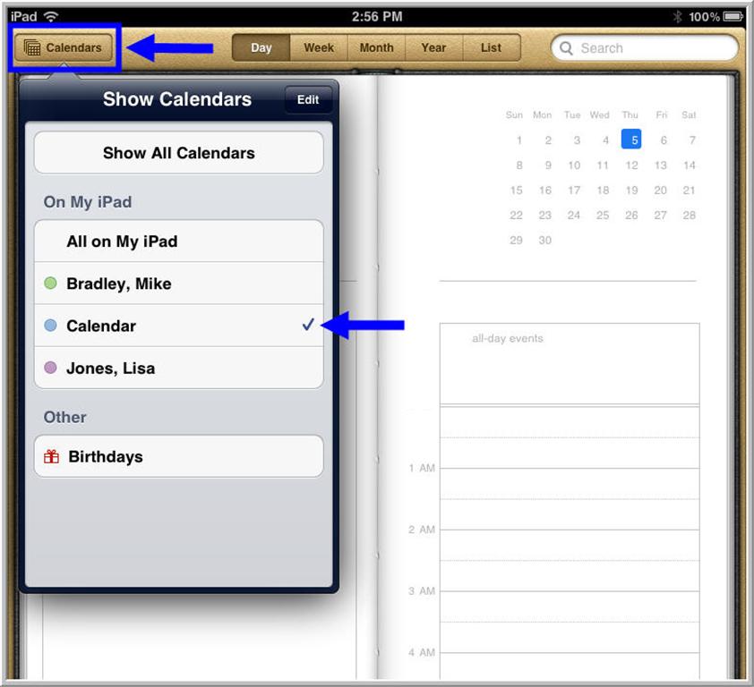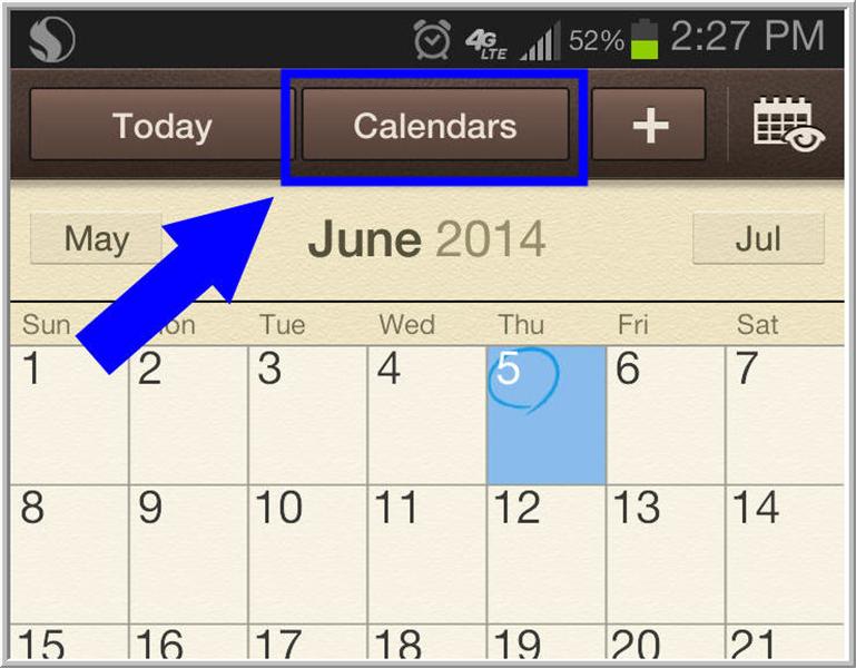 2)Tap the "Calendars" button (some Androids require clicking the device 'Menu' button when in the Calendar application and choosing "Calendars to View").