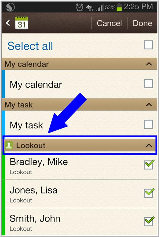 3)Locate the "Lookout" section of calendar folders (some Androids may list this with "LOS"). The 'Lookout' section of selectable calendar folders will show any/all available calendar folders for each user, displayed by their assigned 'Folder Display Name'. In the example below, the user is (John Smith) but also has permissions to see the calendar for (Mike Bradley) and (Lisa Jones). Like the iOS devices, we suggest only checkmarking one calendar folder at a time versus checkmarking multiple calendars to layer overtop each other to ensure new appointments created on the device get placed into the intended calendar folder.